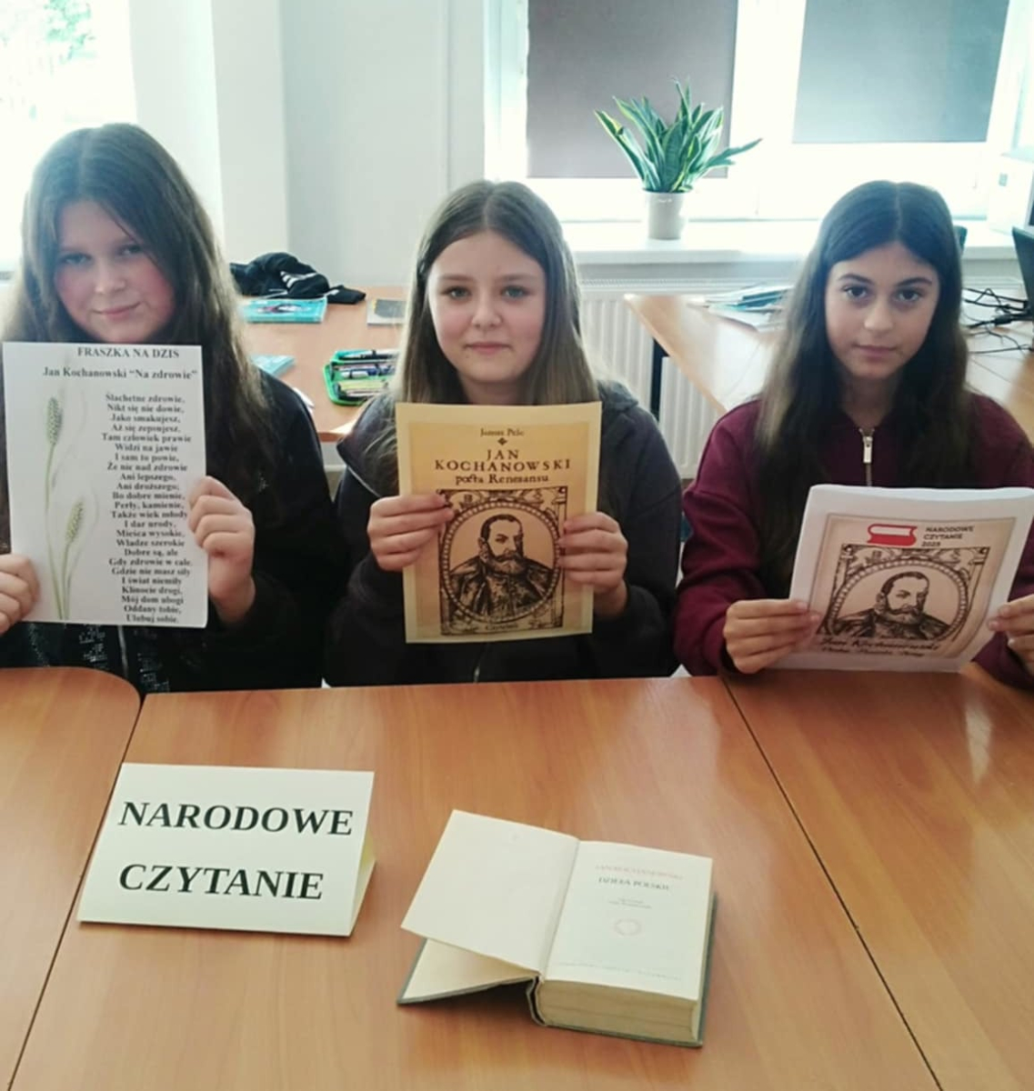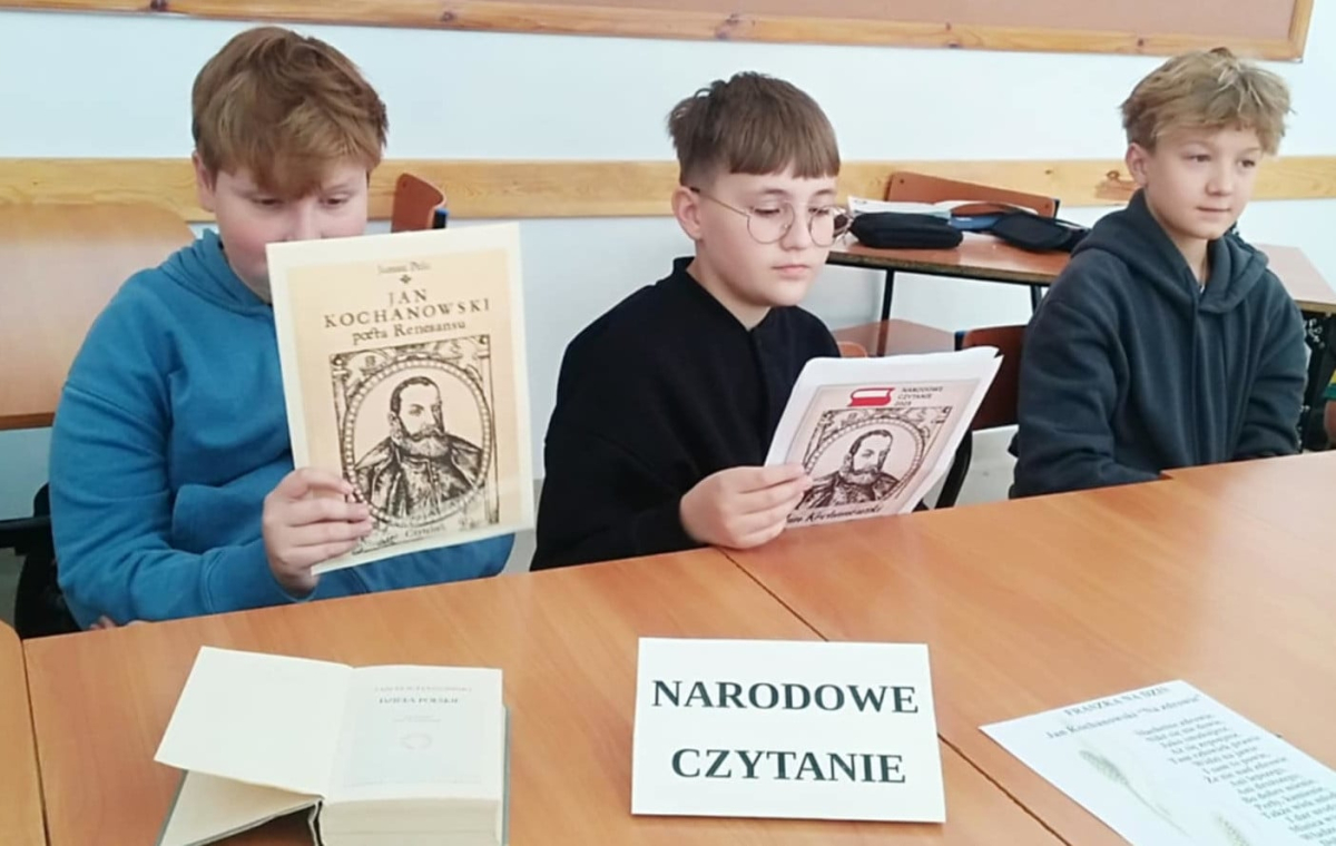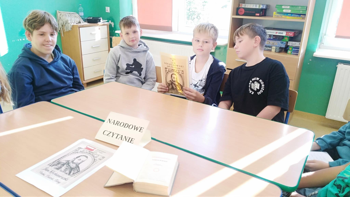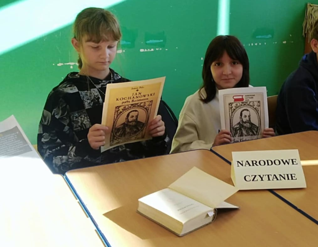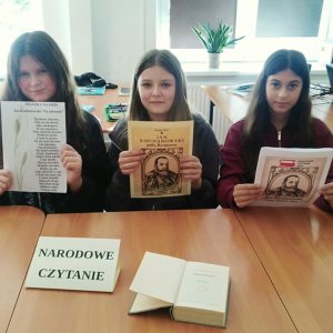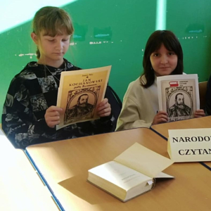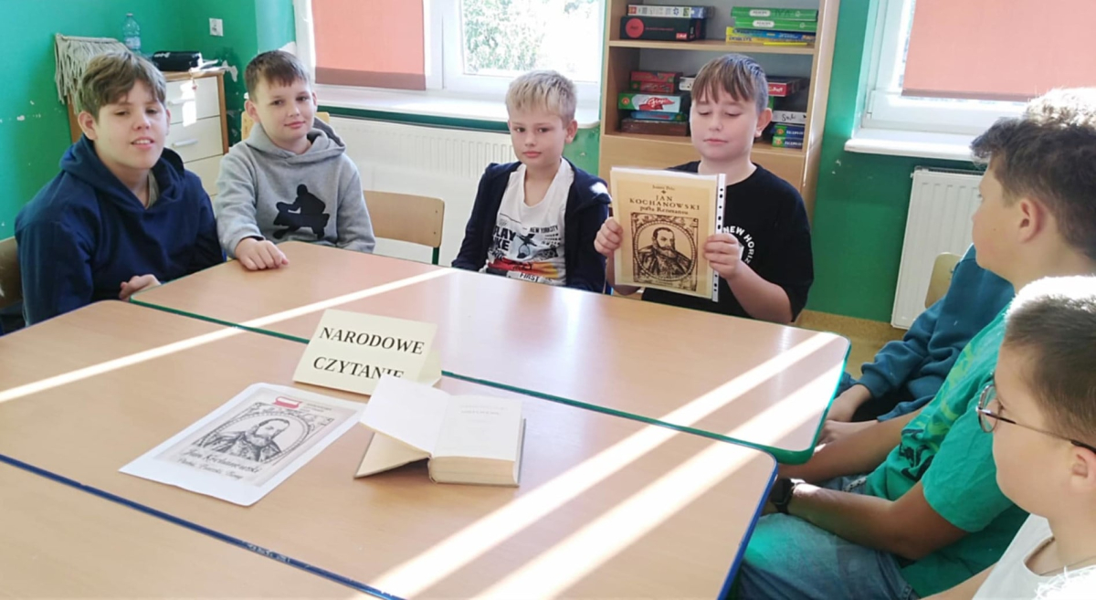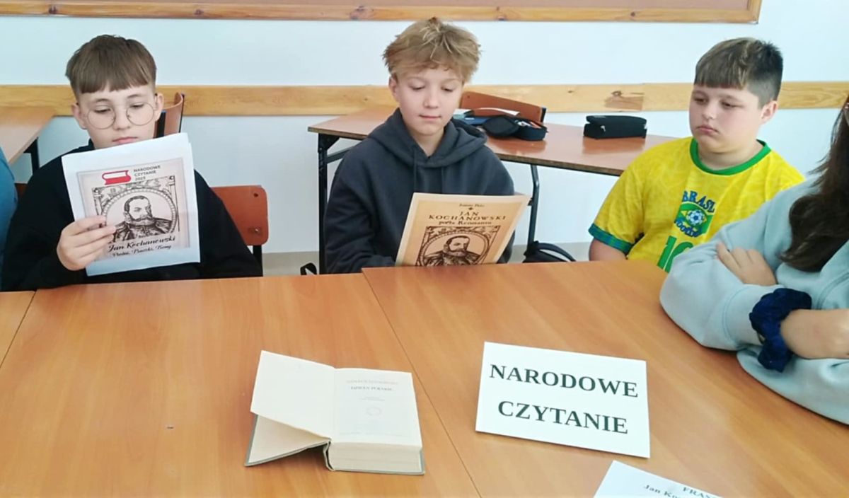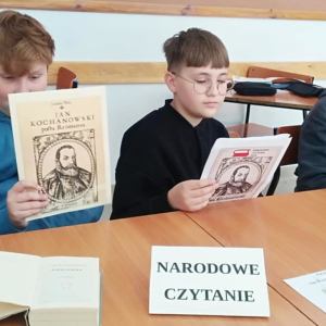 Uczniowie klasy V i VI wzięli udział w akcji Narodowego Czytania. Celem akcji jest popularyzacja czytelnictwa, wzmocnienie poczucia wspólnoty narodowej i kulturowej poprzez wspólne poznawanie kanonu polskiej literatury, promowanie znajomości polskich dzieł literackich oraz dbałość o poprawność i bogactwo polszczyzny. Lekturą tegorocznej edycji Narodowego Czytania jest twórczość Jana Kochanowskiego.