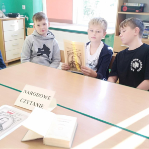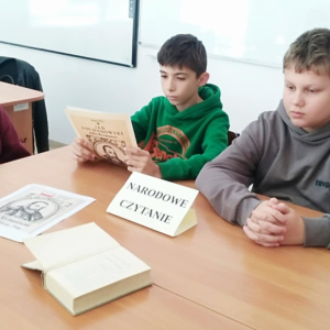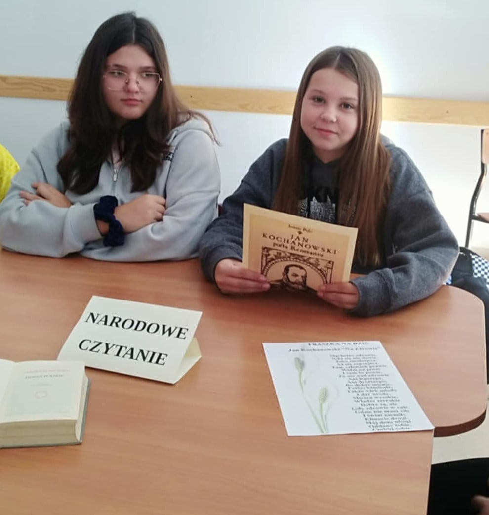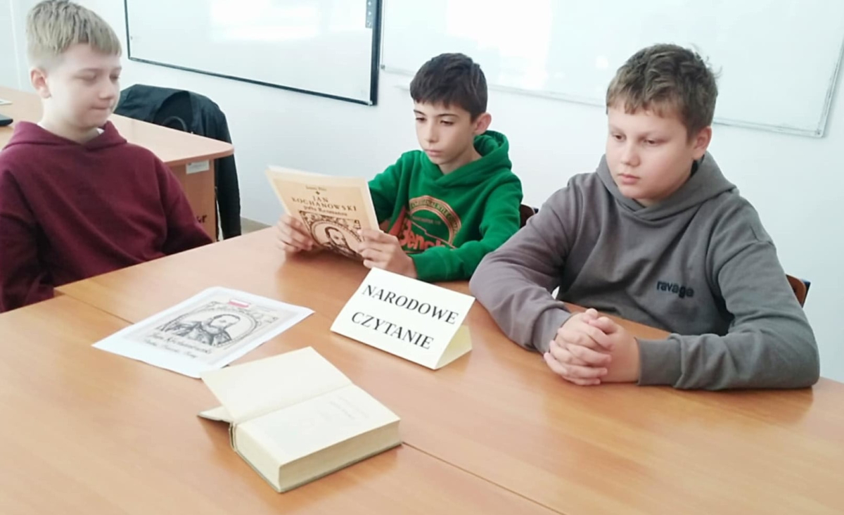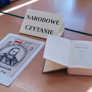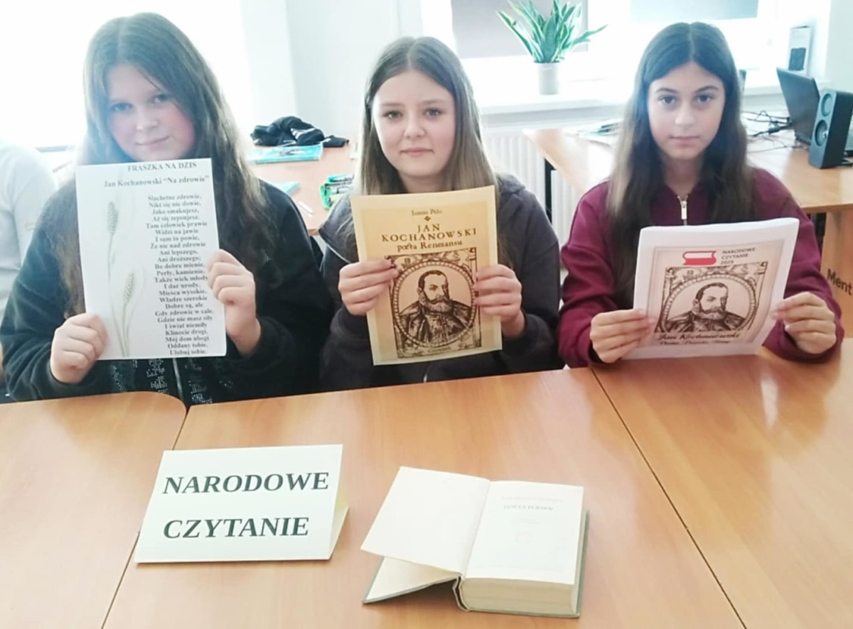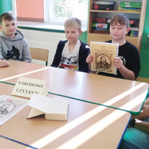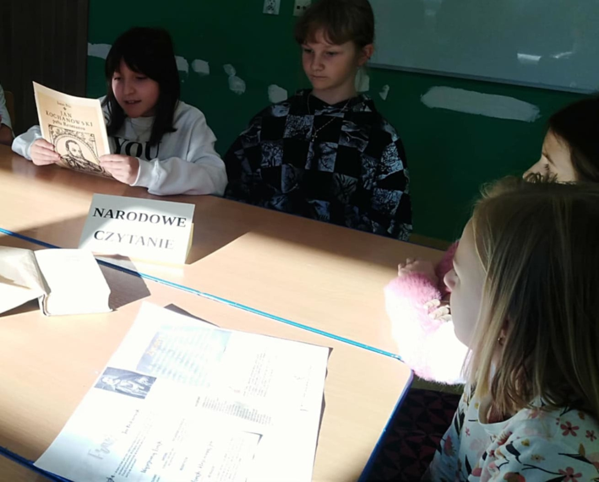 Uczniowie klasy V i VI wzięli udział w akcji Narodowego Czytania. Celem akcji jest popularyzacja czytelnictwa, wzmocnienie poczucia wspólnoty narodowej i kulturowej poprzez wspólne poznawanie kanonu polskiej literatury, promowanie znajomości polskich dzieł literackich oraz dbałość o poprawność i bogactwo polszczyzny. Lekturą tegorocznej edycji Narodowego Czytania jest twórczość Jana Kochanowskiego.