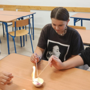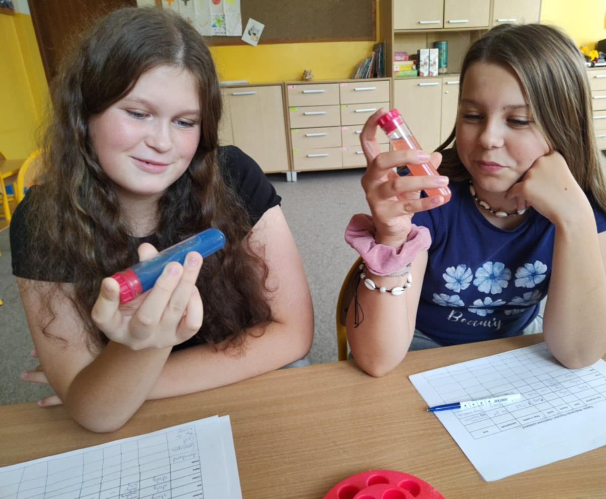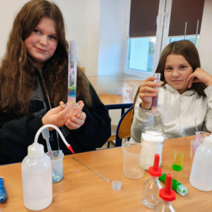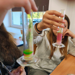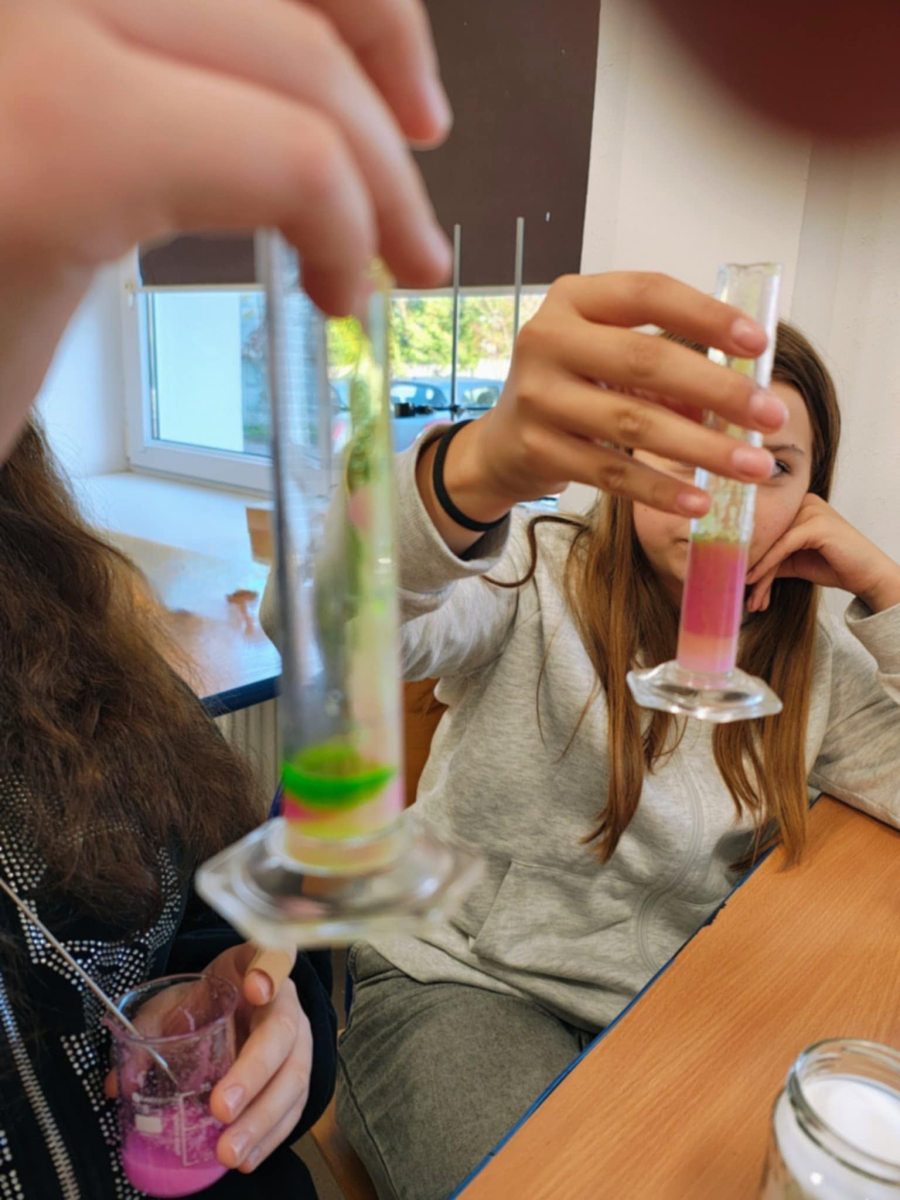 Uczniowie klasy 6 na zajęciach chemicznych przeprowadzali proste doświadczenia laboratoryjne, porównywali gęstość różnych cieczy i ciał stałych, a także właściwości fizyczne i chemiczne różnych substancji. Zajęcia kształtowały kompetencje przyrodnicze i eksperymentalne uczniów.